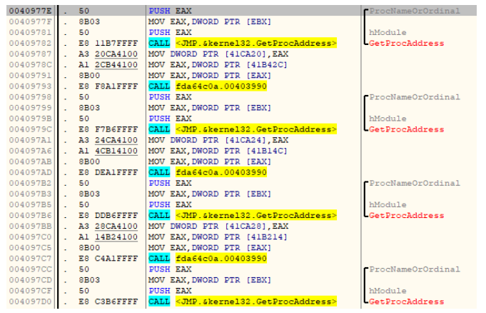 Depois de se aprofundar no depurador, você pode ver que há cargas estáticas de funções da DLL que removem a criptografia que está dentro do navegador para extrair as senhas abertamente: