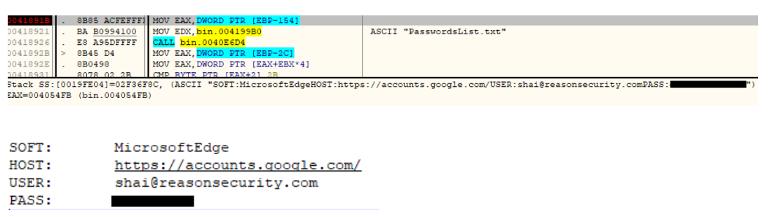 O malware pede o “login data” E o transfere temporariamente para “C:\windows\temp”, Esta informação é construída em cima de uma estrutura de dados chamada Sqlite3 DB e para ler nossas informações o malware deve consultr deste banco de dados para extrair as senhas salvas e depois de fazer isso com sucesso usando as funções carregadas de nss3.dll ele as salva em um arquivo chamado “PasswordList.txt”: